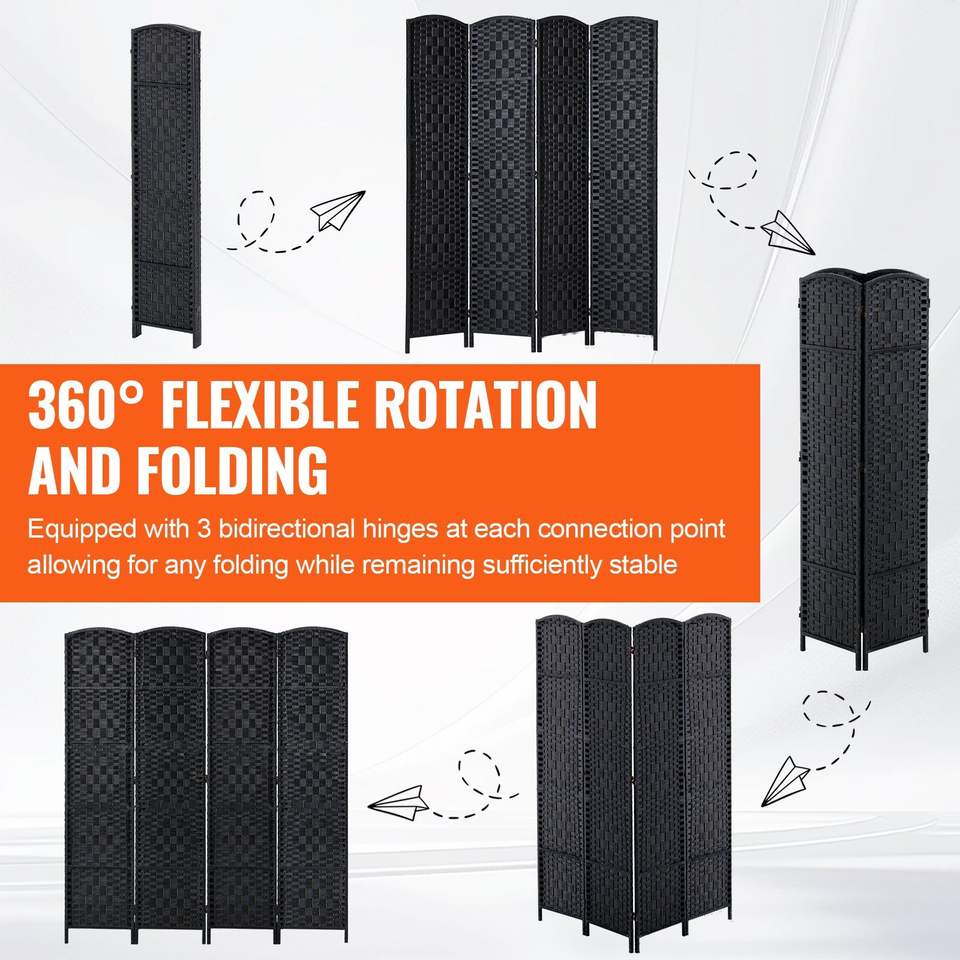 Hand-Woven 4-Panel Portable Freestanding Room Divider Black Folding Privacy Screen with Hinges for Wall Separation & Privacy