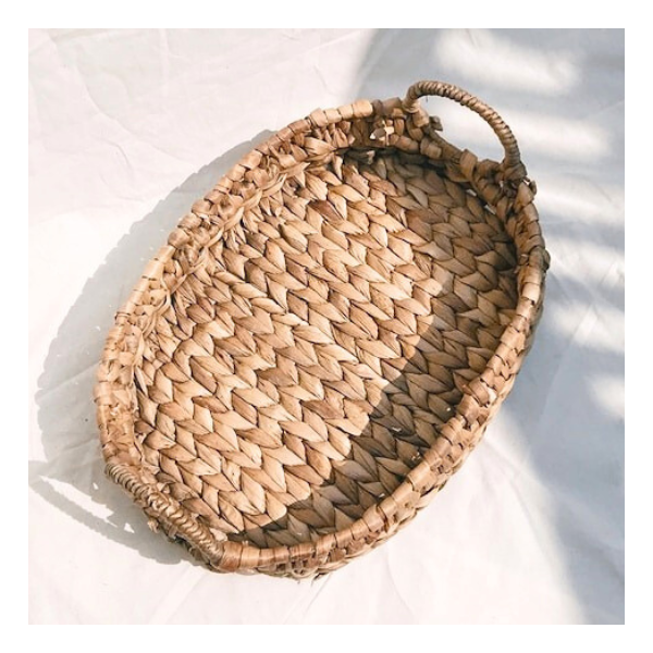 Large Vintage Round Rattan Bottom Serving Tray with Hand-Woven Water Hyacinth and Handle Hand-Made Food Tray