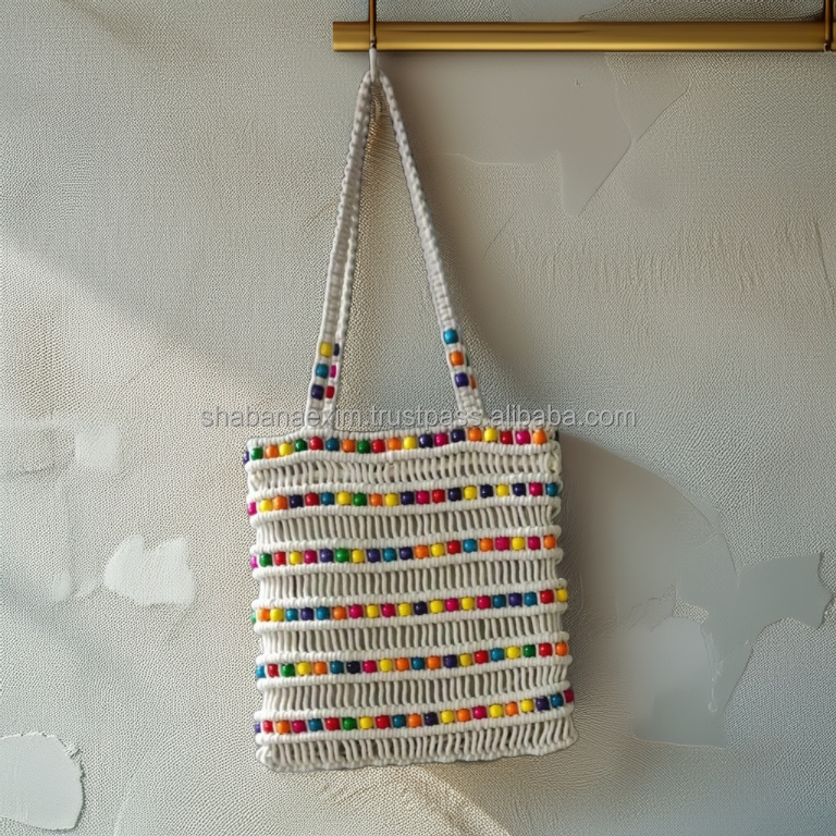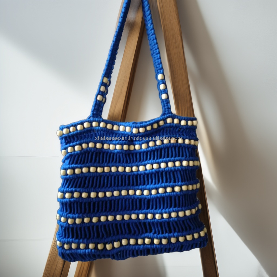Hand Woven Macrame Crossbody Purse for Everyday Wear Sustainable Macrame Blue Hand Bag with White Beaded