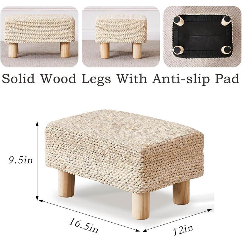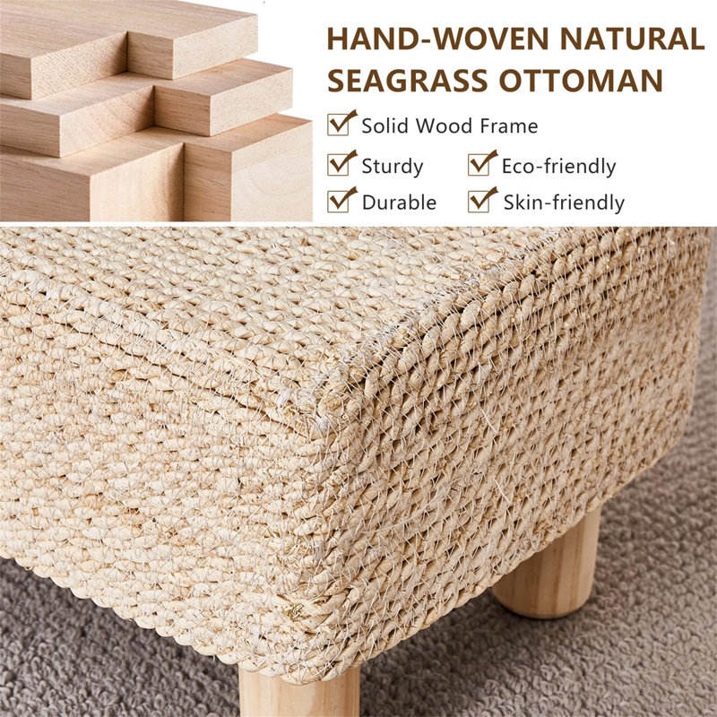 Hand-Woven Natural Seagrass Rectangular Ottoman with Wooden Legs Natural Seagrass Foot Stool for Living Room Bedroom Entryway