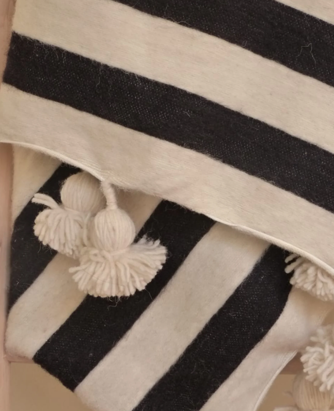 Mode:Hand Woven Striped Black And White Pompom Throw Blanket