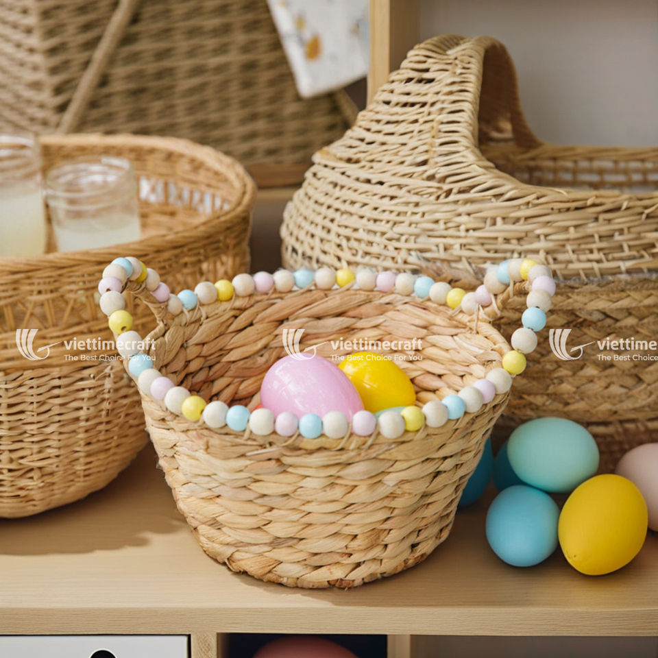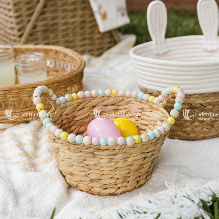 Hand-Woven Vietnam Bead Easter Water Hyacinth Bunny Egg Basket Elegant Easter Holiday Party Decorations With Bead Handle