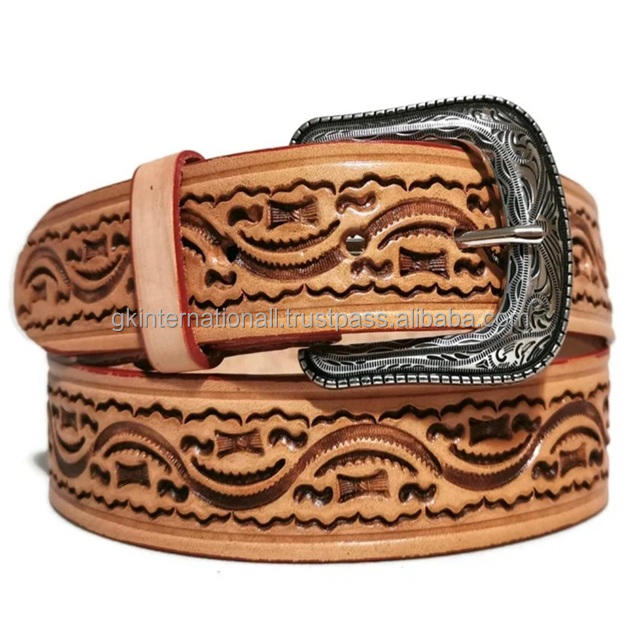 Hand carved engraved design custom made Durable Full Grain Genuine western leather tooling belt for unisex removable buckle