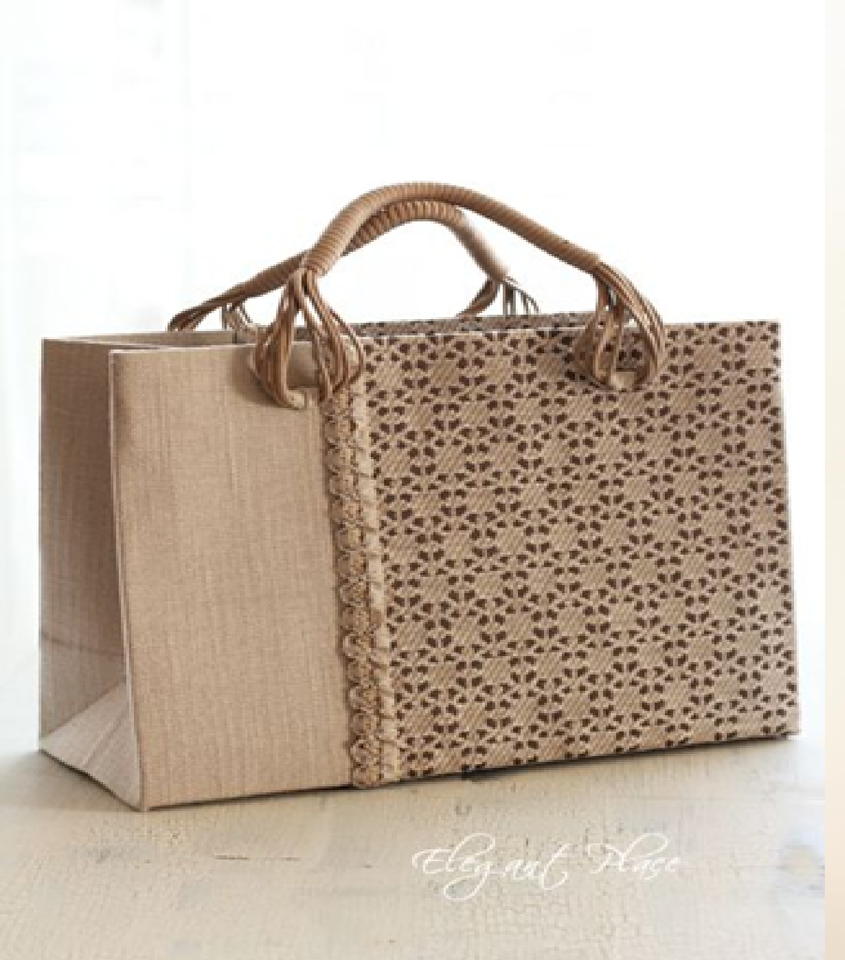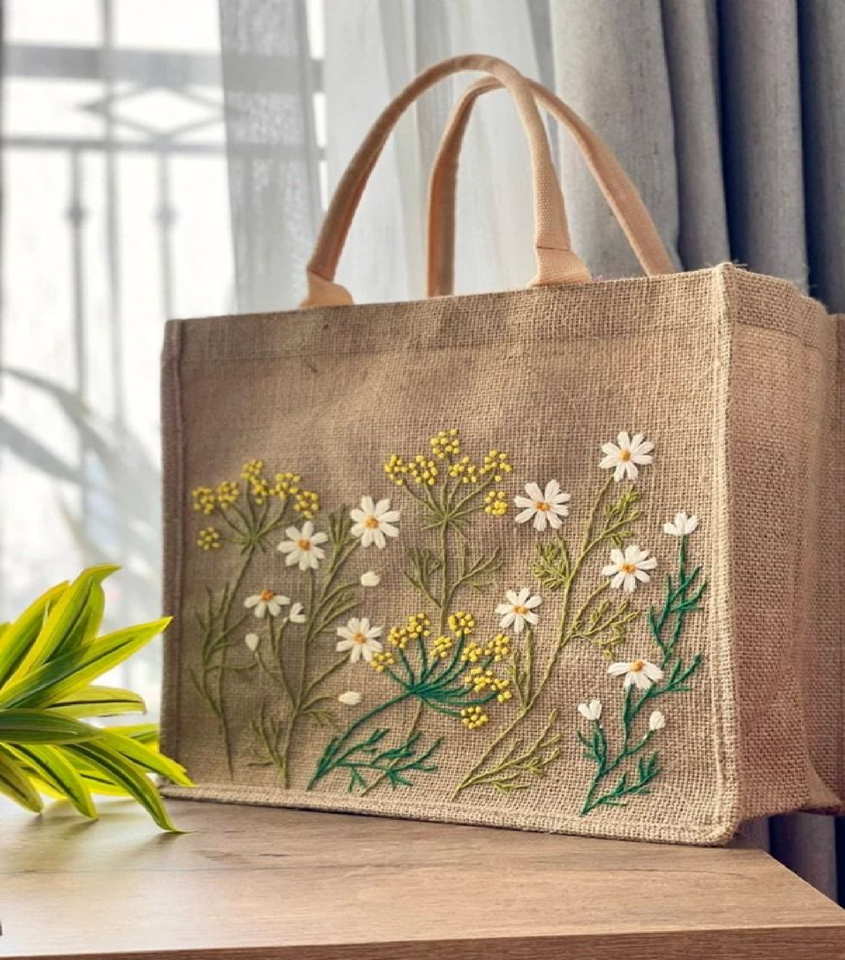 Hand-embroidered jute tote bag with white and yellow daisy flowers and green stems, available at wholesale prices.