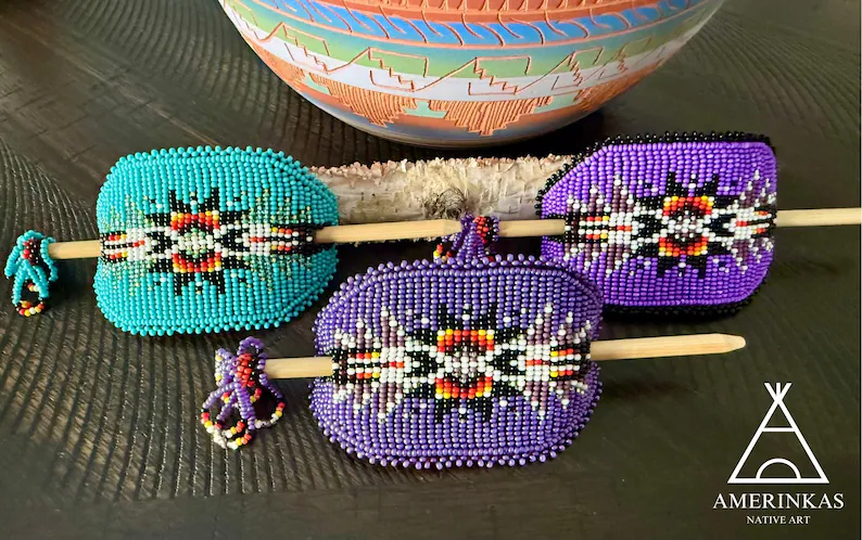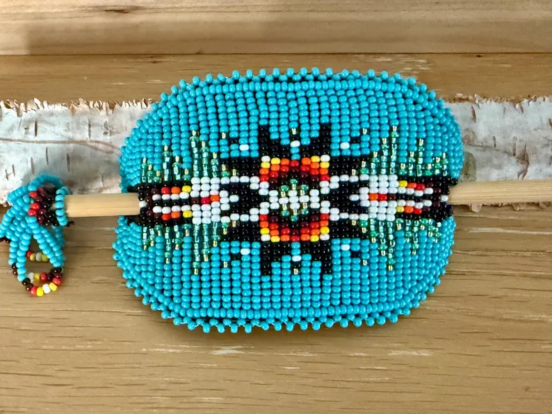 Hand made Beaded Barrette, Beaded Hair Barrettes, Indigenous Beaded Hair Bun with Sticks, Navajo Beaded Barrette,