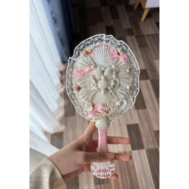 Hand mirror decorated with assorted shells, perfect for beach lovers, compact beauty tool with tropical feel