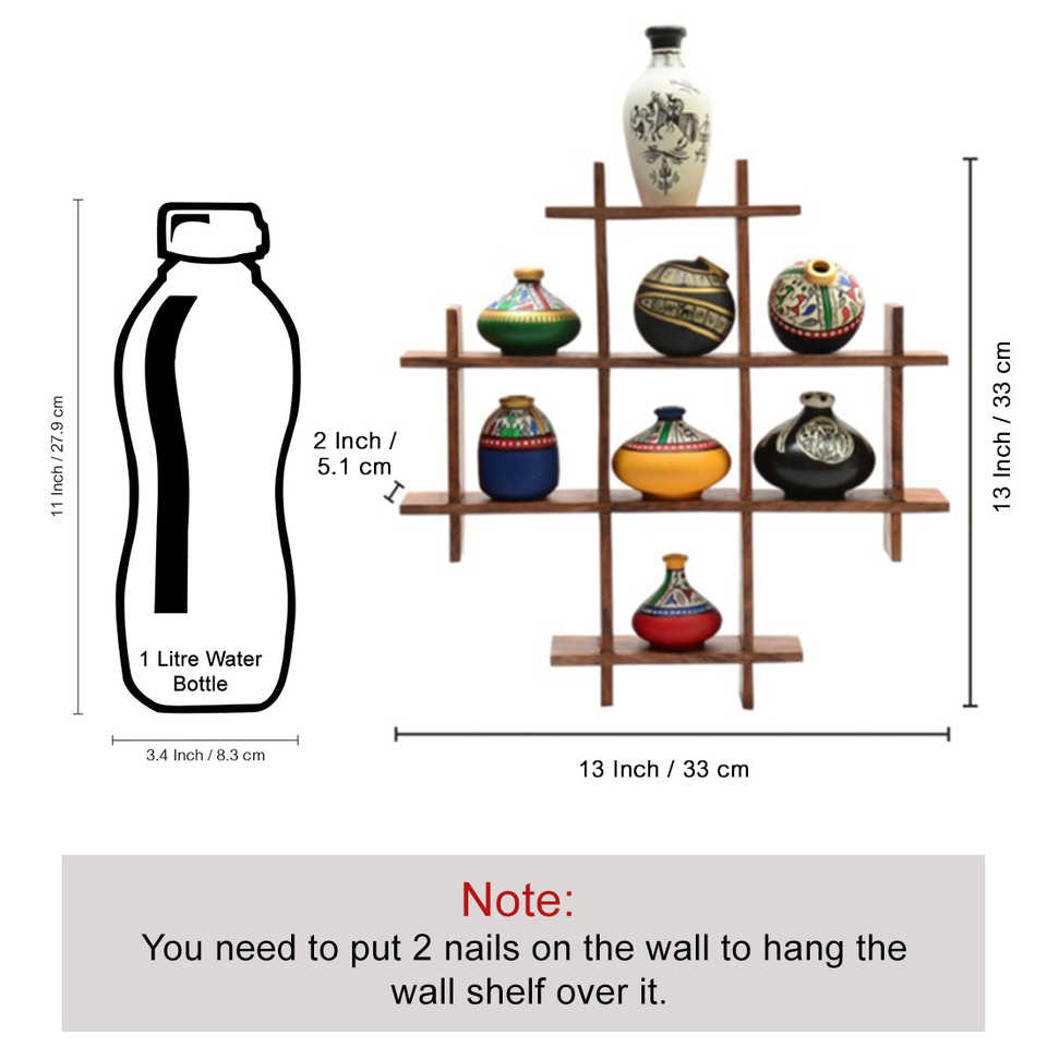 Hand-painted Terracotta Warli 8 Pots Wall Decor Wall Shelf Hanging Wooden Frame Wall Art Home Decor