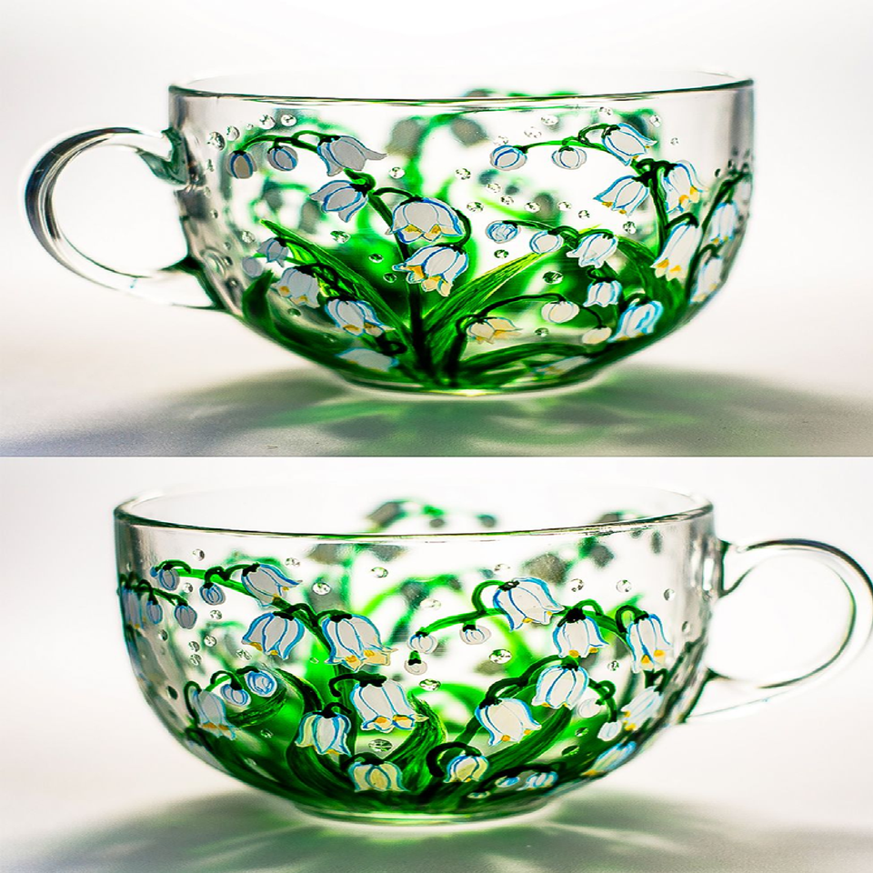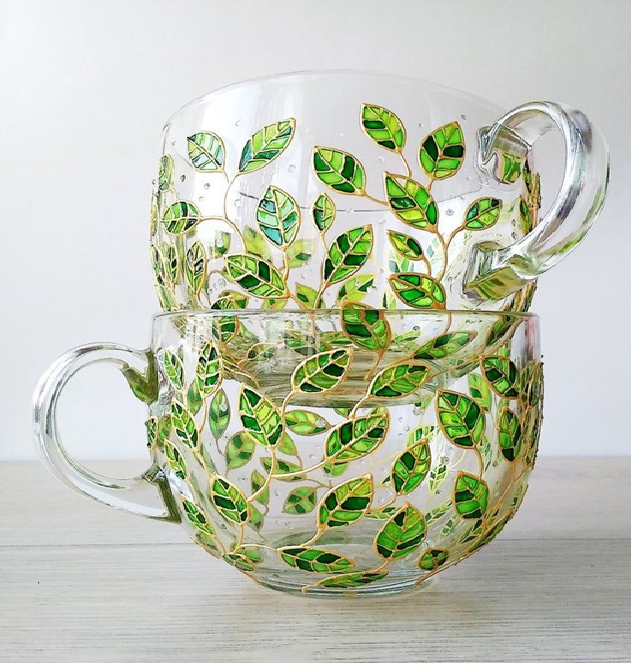 Hand-painted glass mugs with a vibrant green leaf design, perfect for a nature-inspired aesthetic, available at wholesale prices
