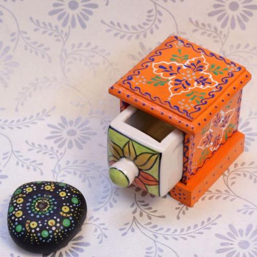 Hand painted wooden box with 1 ceramic drawer floral motifs jewelry spice trinket storage decorative indian handicraft