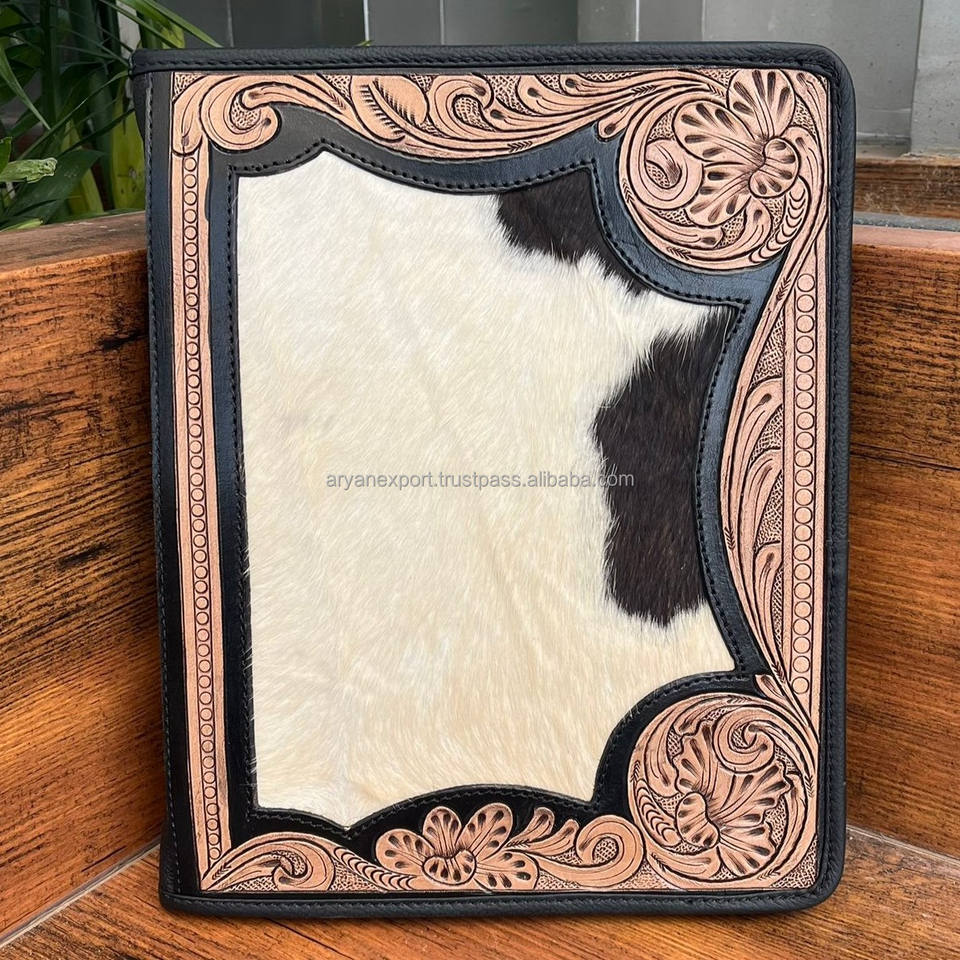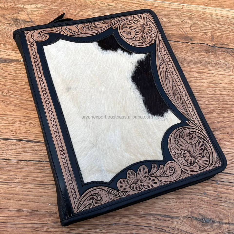 Hand-tooled Cow Leather Zipper Portfolio Padfolio Folder A4 Portfolio 3 O Ring Binder with Tablet Pocket Zipper Portfolio Binder