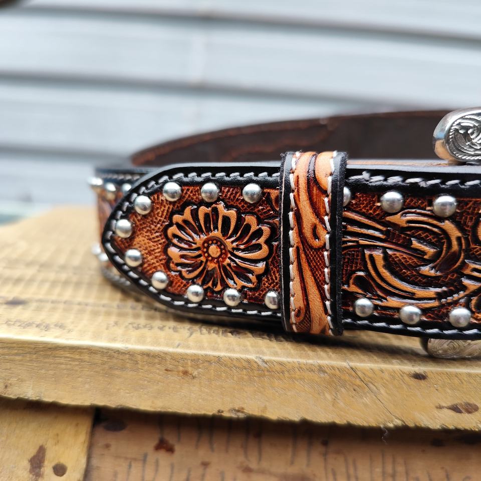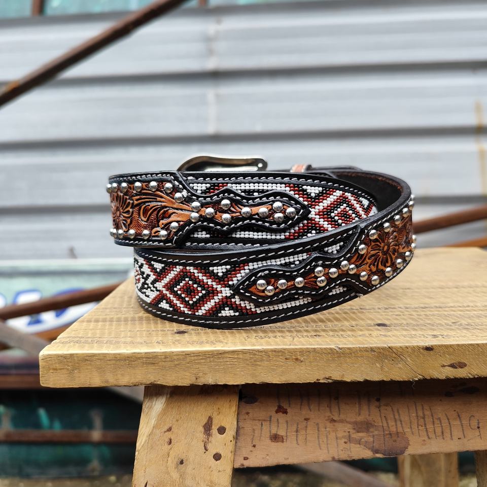 Hand tooled western leather belt Southwestern beaded cowboy belt Vintage silver buckle rodeo belt At Best Price