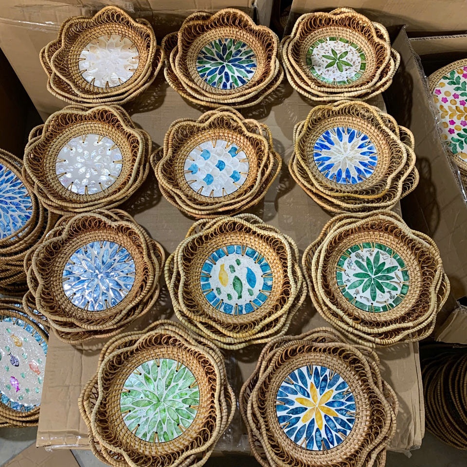 Hand-woven Rattan and Capiz Shell Inlay Serving Tray Floral Shell Inlaid Rattan Tray Colorful Seashell Rattan Tray Mosaic