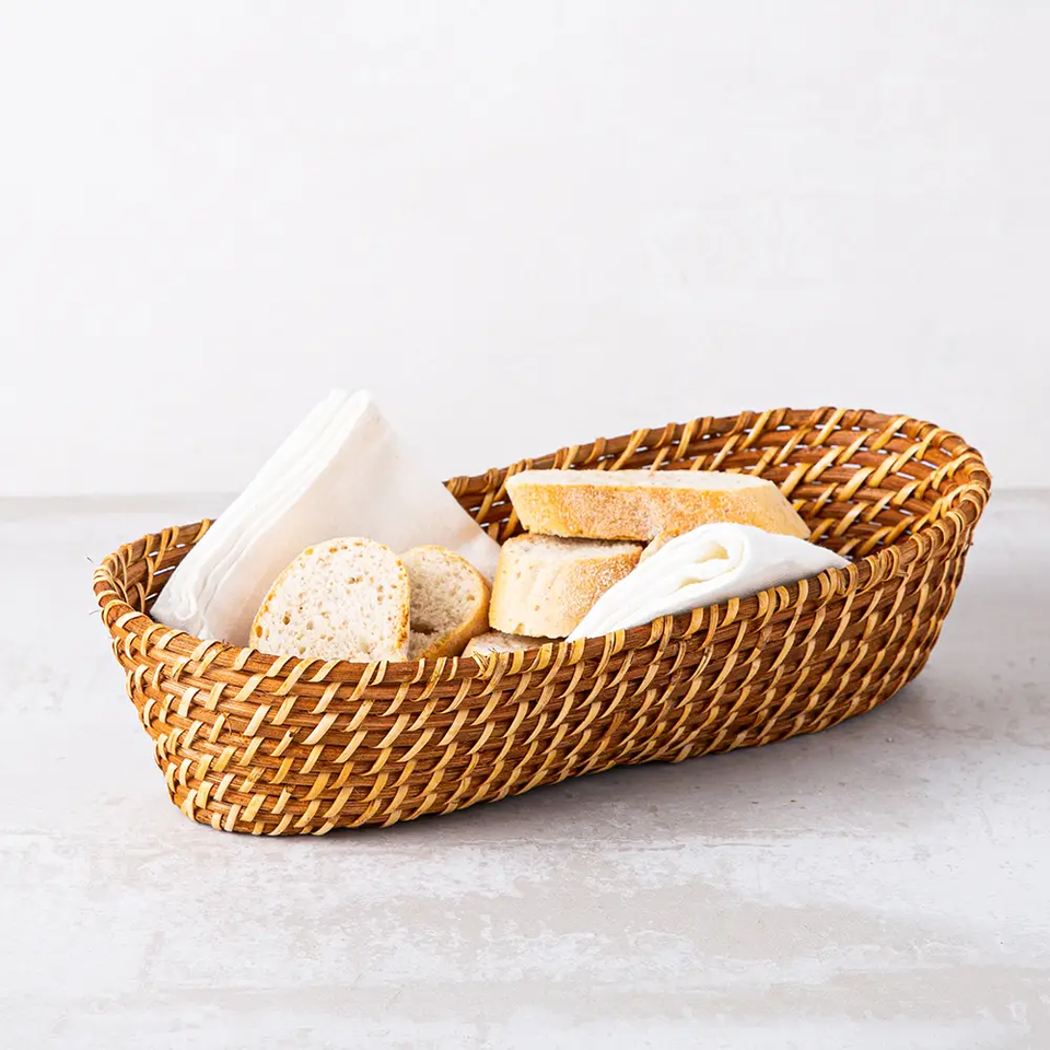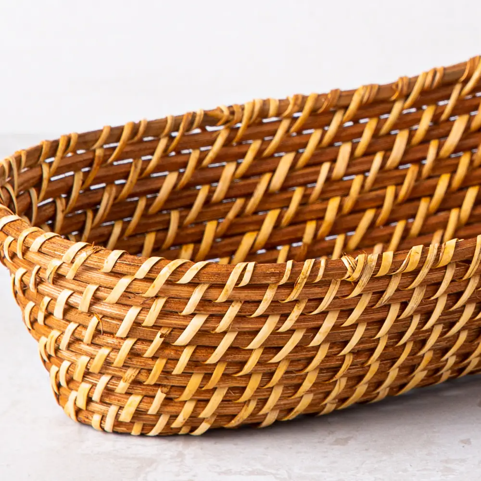 Hand woven oval rattan, bamboo, water hycinth, seagrass basket for holding bread and fruit, objects. Fashionable design