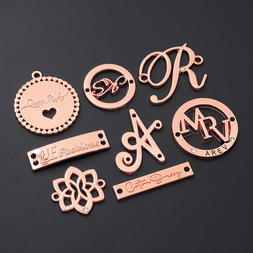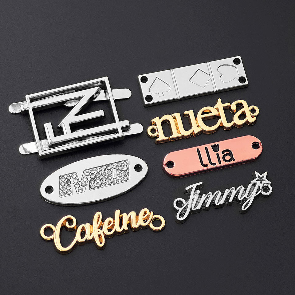 Custom Brand Clothing Tags Gold Rectangle Square Pattern Roll Shape Metal Shoe Handbag Tags with Hijab Abaya Scarf Custom Logo