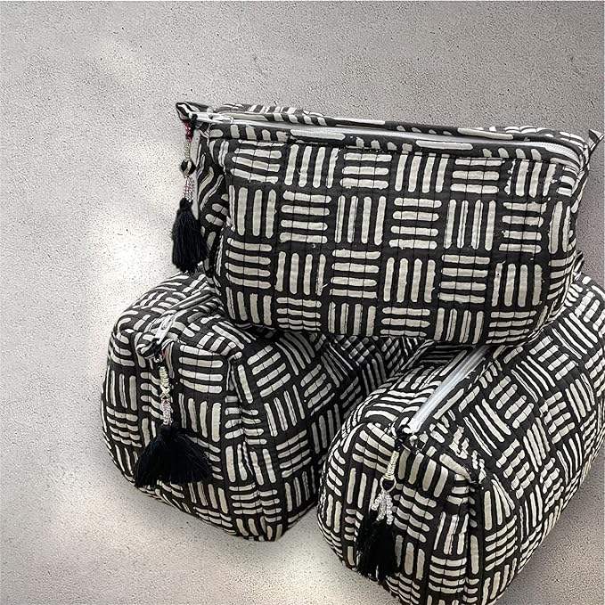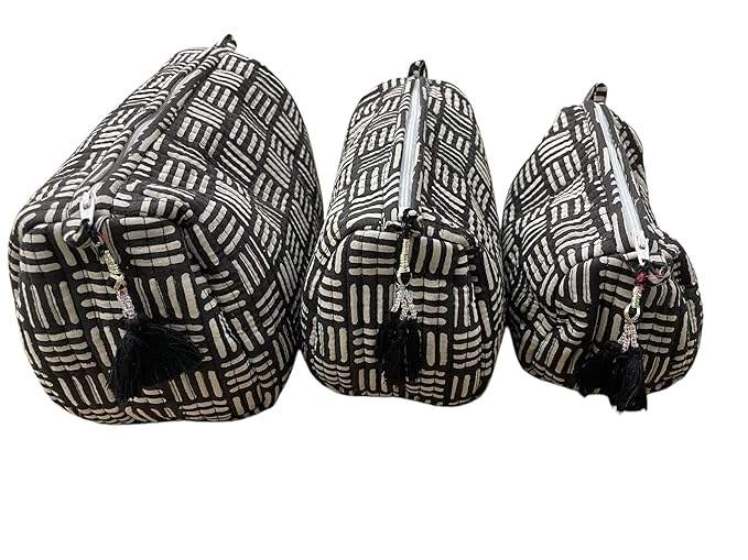 Handblock Cotton Vintage Eco-Friendly Travel Case 3 Bags Makeup Jewellery Stationery Storage Waterproof Machine Washable Black