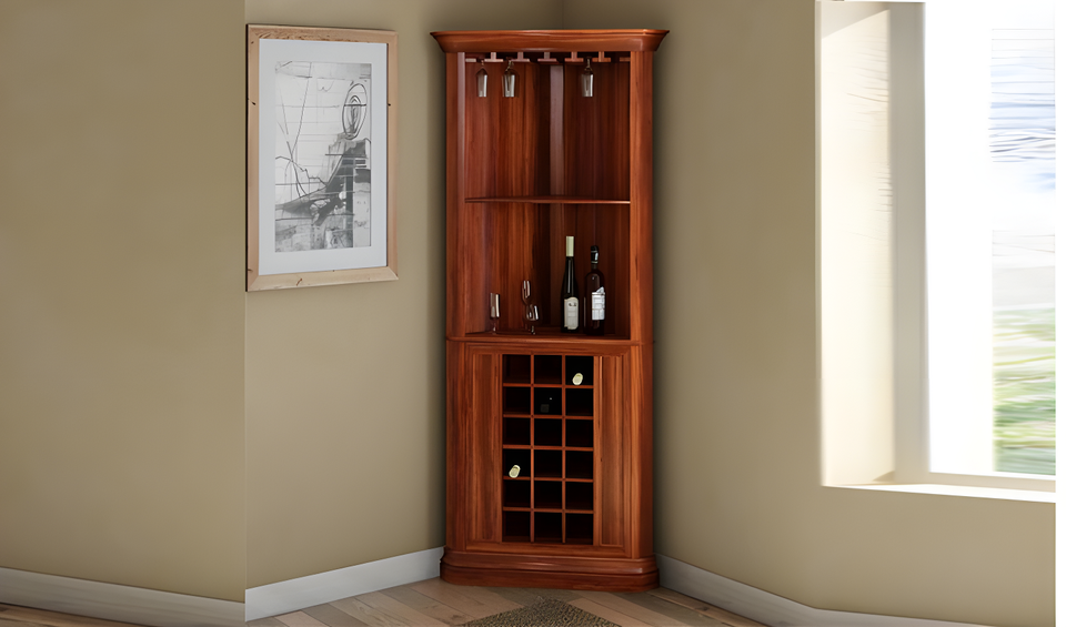 Handcrafted 18-Bottle Solid Teak Wood Modern Wine Cabinet with Stainless Steel Bar Shelf and Glass Holders Corner Storage Unit