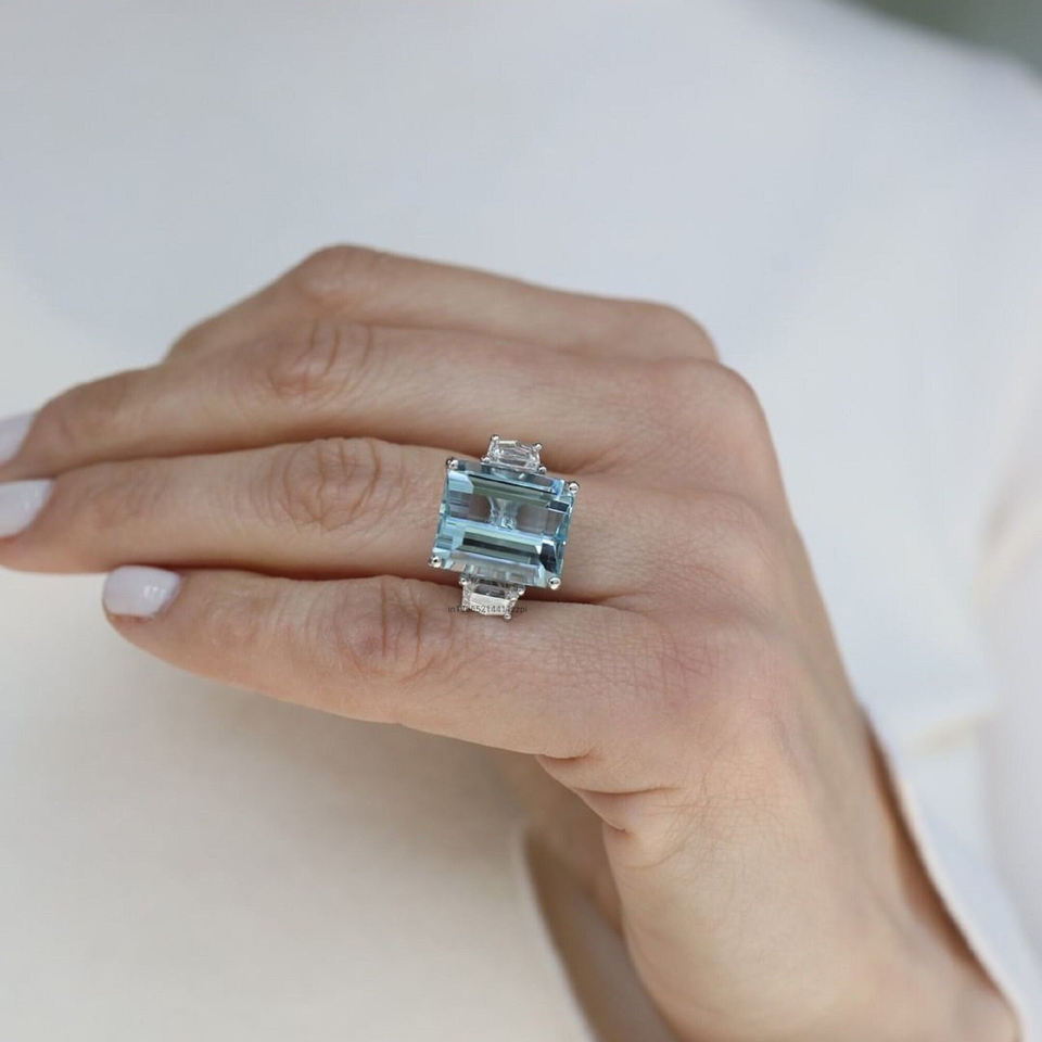 Handcrafted 8.50 Carat Light Blue Aquamarine Ring with Emerald Cut and Half Moon Accents Ideal March Birthstone Gift for Women