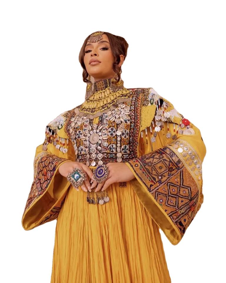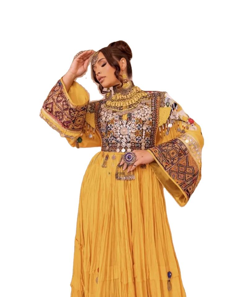 Handcrafted Afghan Yellow Traditional Dress With Heavy Kuchi Embroidery Mirror Coins And Tribal Work Flowing Maxi Glowing