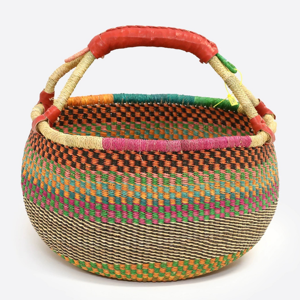 Handcrafted African Bolga Basket with Leather Handle for Market Shopping Storage and Eco Friendly Home Decor