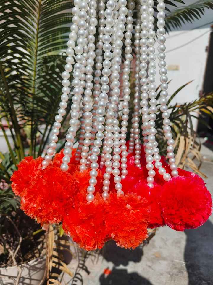 Handcrafted Artificial Garlands Made With Pearls And Marigold-Like Fluffy Flowers, Ganpati Poojan Or Wedding Decorative Strings