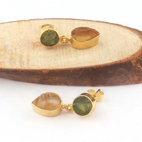 Handcrafted Birthstone Jewelry Natural Raw Citrine Peridot Teardrop Hook Earrings Gold Plated Collet Set Drop Dangle Earrings
