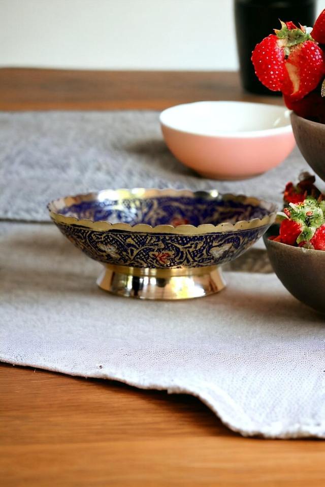 Handcrafted Blue And Gold Enamel Metal Decorative Bowl On Stand For Fruit Display Gift Serving And Luxury Dining Decor