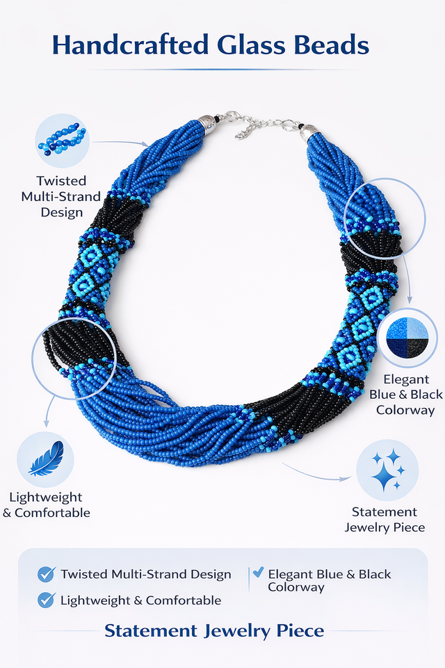 Handcrafted Blue & Black Glass Beaded Layered Quartz Necklace Vintage Twisted Multi-Strand Statement Jewelry with Metal Clasp