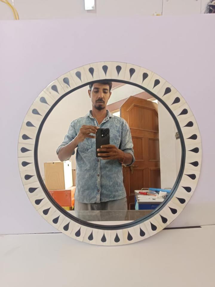 Handcrafted Blue & White Round Bone Inlay Mirror Geometric Chevron Pattern Wall Decor Accent Mirror Handmade Indian Furniture