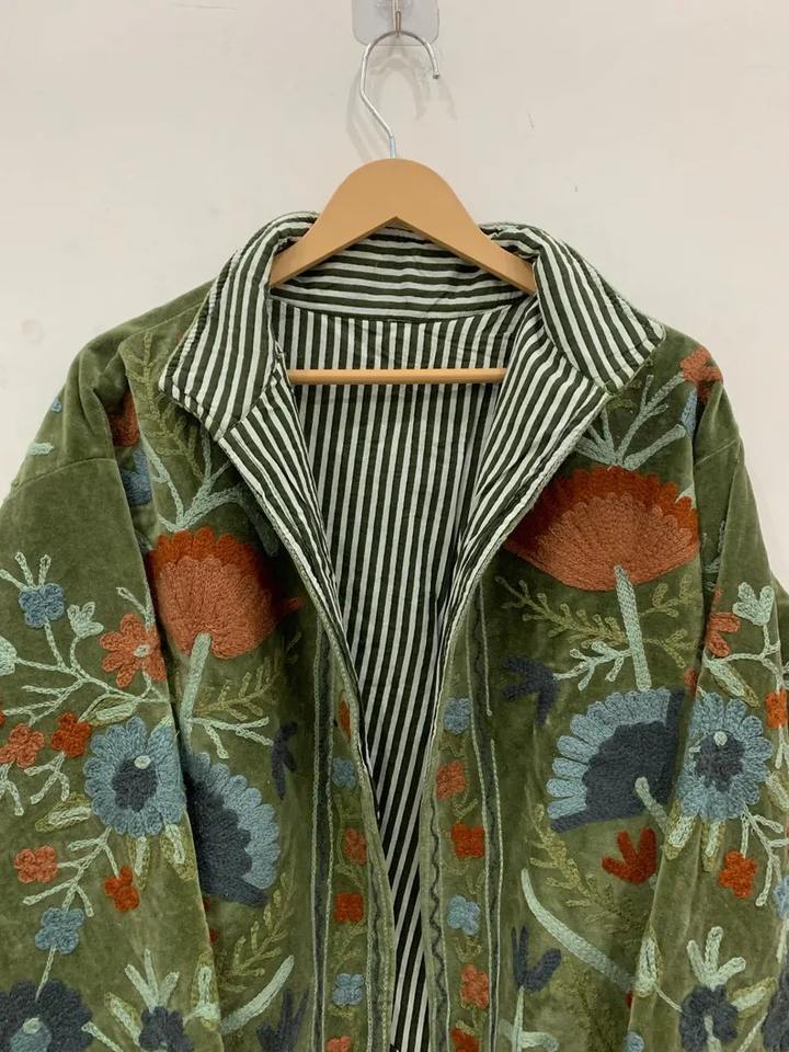 Handcrafted Bohemian Boho Green Velvet TNT Suzani Jacket With Pocket Winter Jacket Embroidered Jacket Coat For Womens