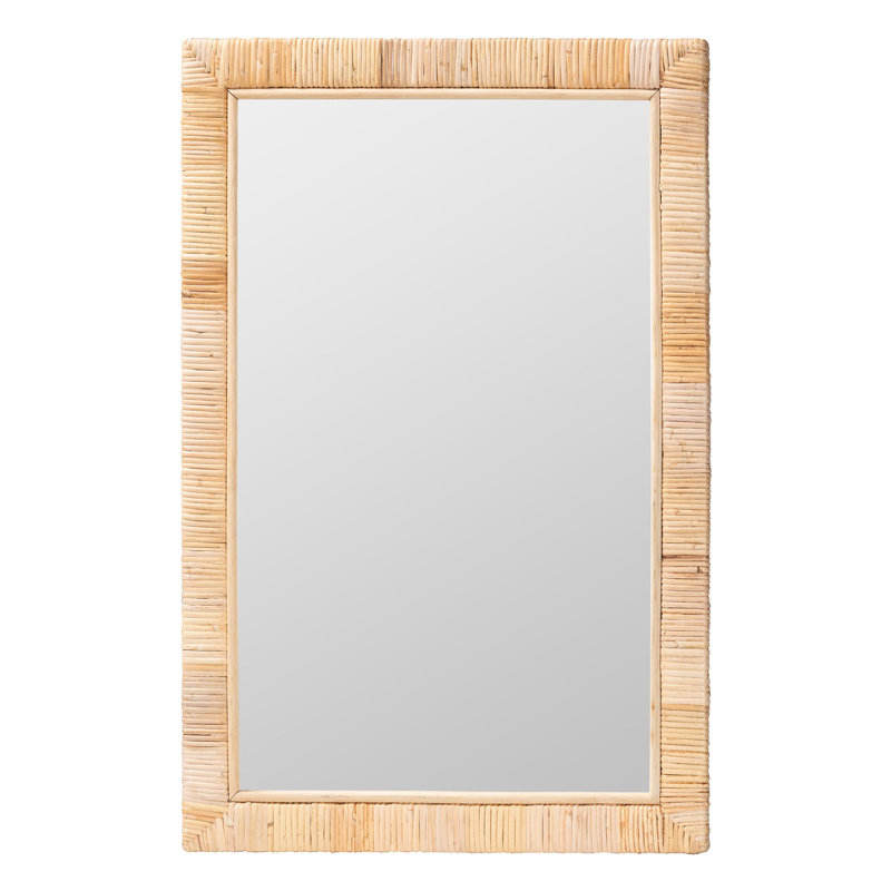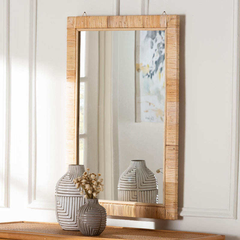 Handcrafted Bohemian Rattan Accent Wall Mirror with Natural Frame