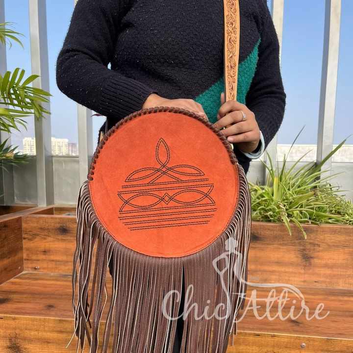 Product name:Hand Tooled Suede Leather Round Fringe Bag
