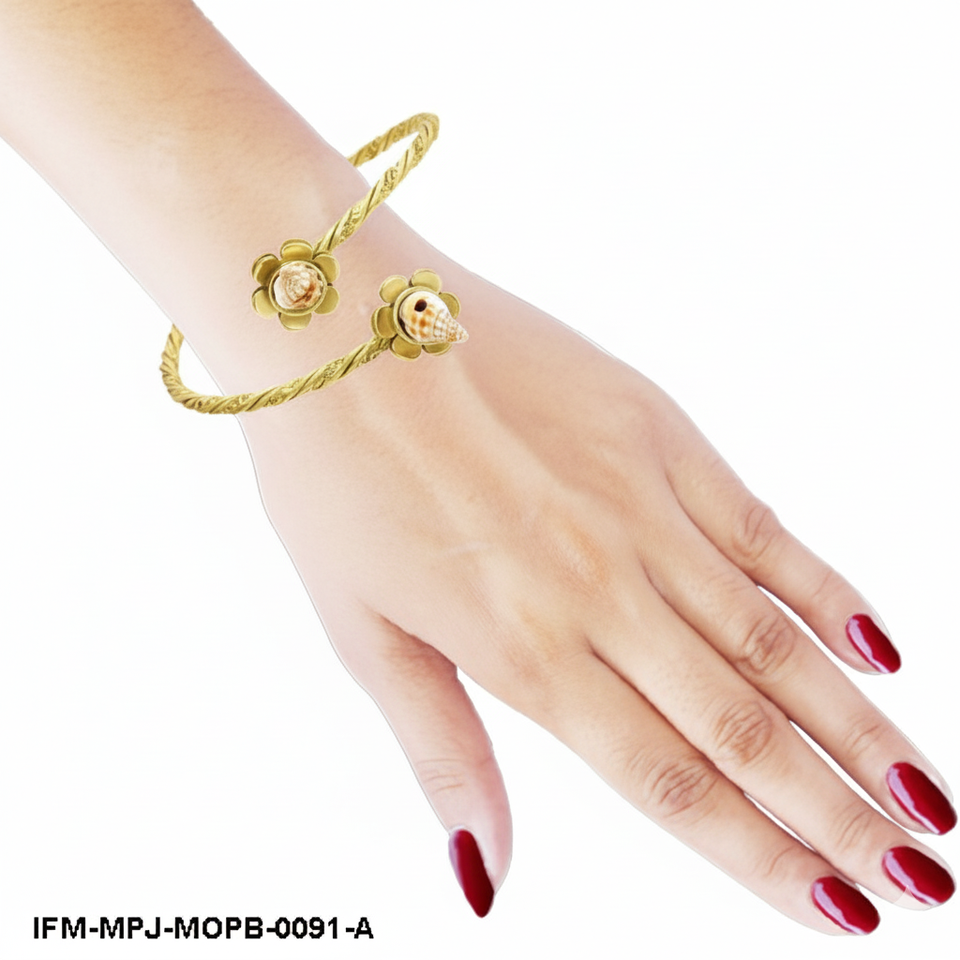 Handcrafted Brass Bypass Bangle with Natural Cowrie Shell & Mother of Pearl Accents Gold Tone Floral Nautical Jewelry