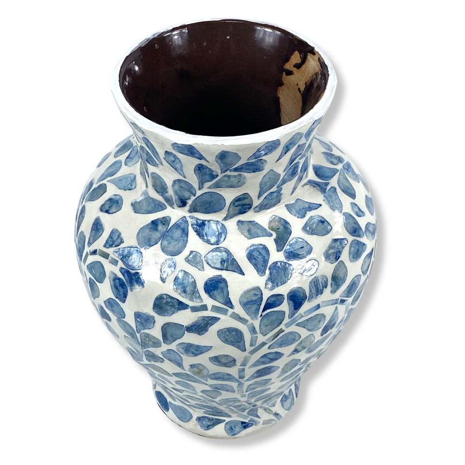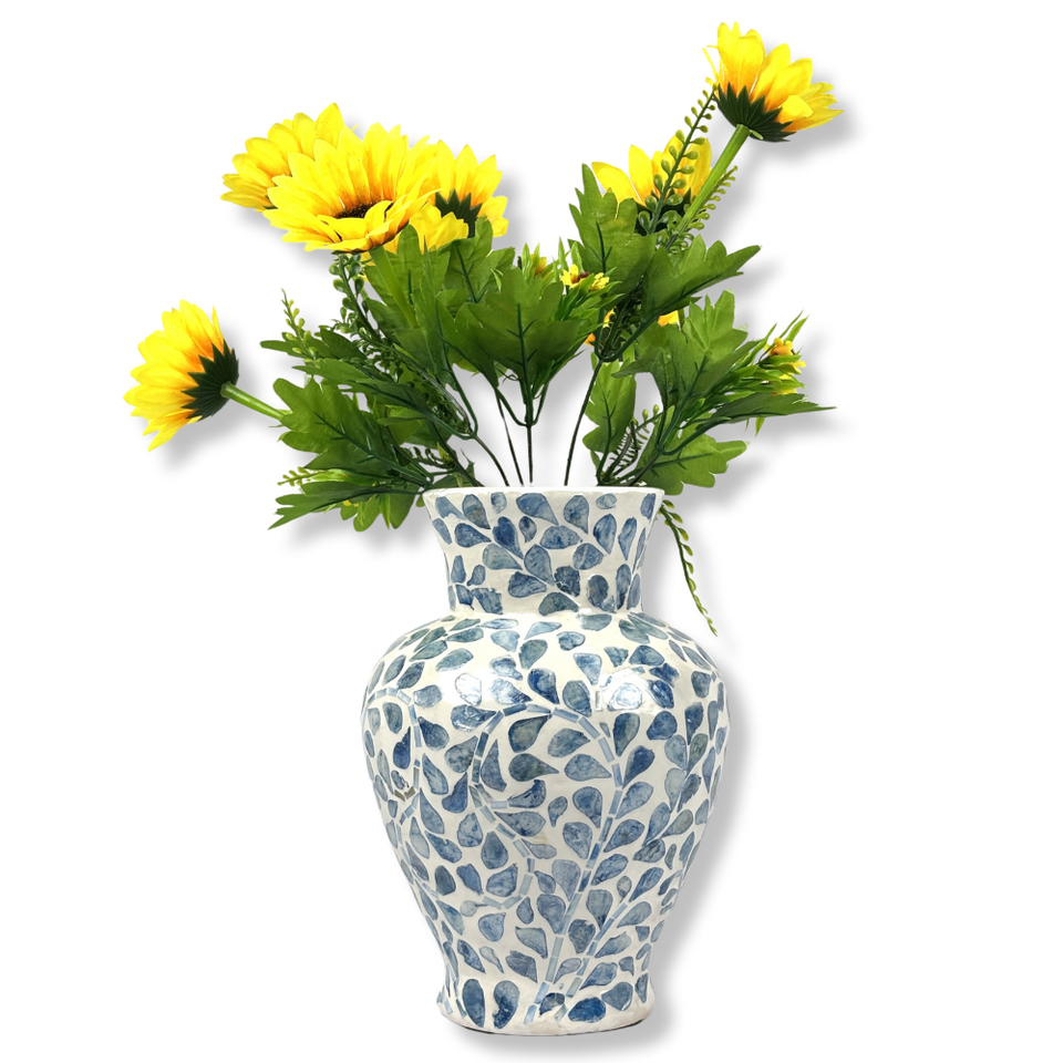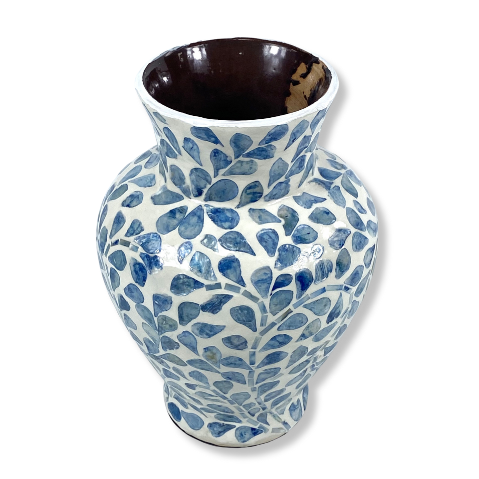 Handcrafted Ceramic Mother of Pearl Inlay Vase with Blue Leaf Pattern Curvy Decorative Flower Pot for Living Room Home Decor