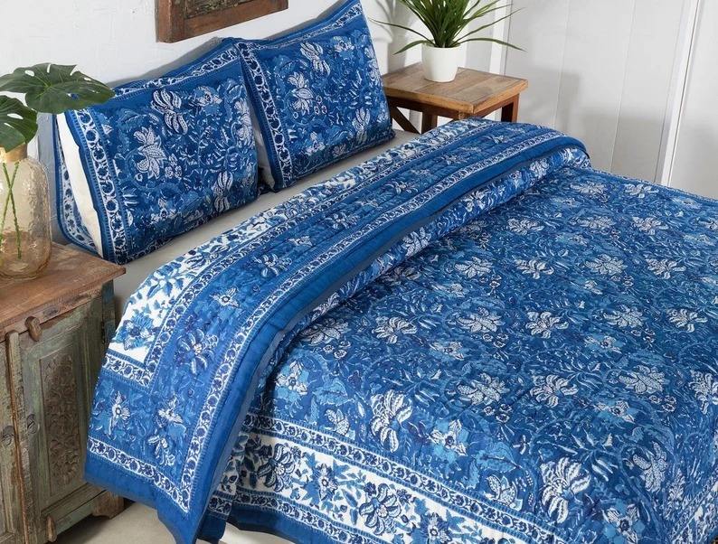 Handcrafted Cotton Quilt Rajai Indian Handmade Block Printed Bed Cover Natural Cotton Filling Razai Jaipuri Rajai