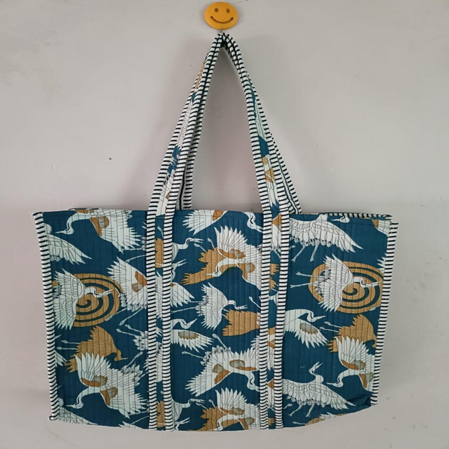 Handcrafted Crane Bird Print Quilted Cotton Tote Bag Long Shoulder Handles Reusable Womens Travel Shopping Large Capacity Open