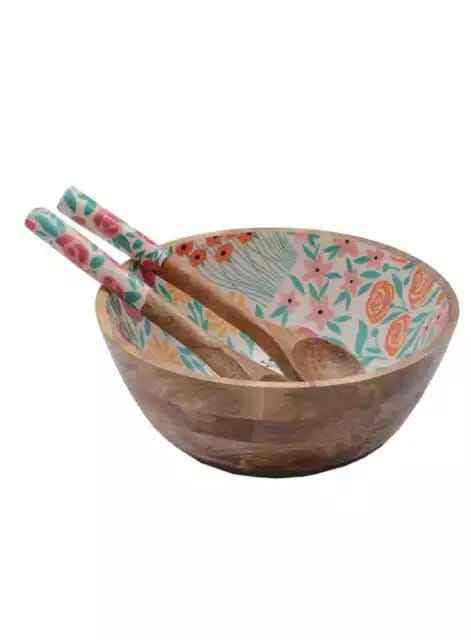 Handcrafted Eco-Friendly Wooden Bowl with Decorative Enamel Interior Luxury Serving Spoons for Home & Party Use