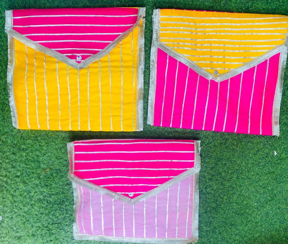 Handcrafted Festive Fabric Envelope Set in Vibrant Pink and Yellow Tones featuring elegant silver zari stripes