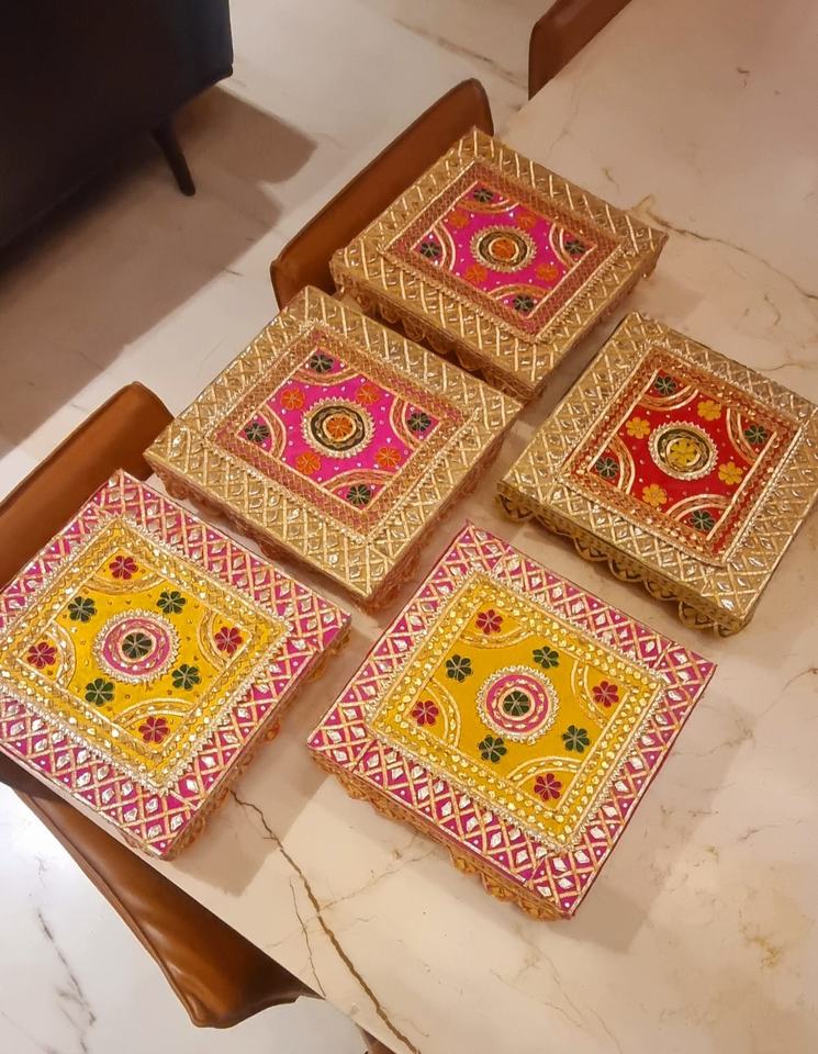 Handcrafted Festive Square Kumkum and Jewellery Box Set with Traditional Rajasthani Art Vibrant Pink Yellow Red Tones
