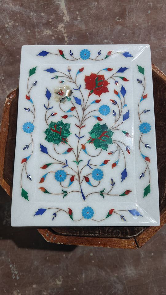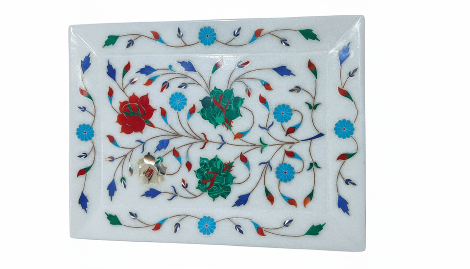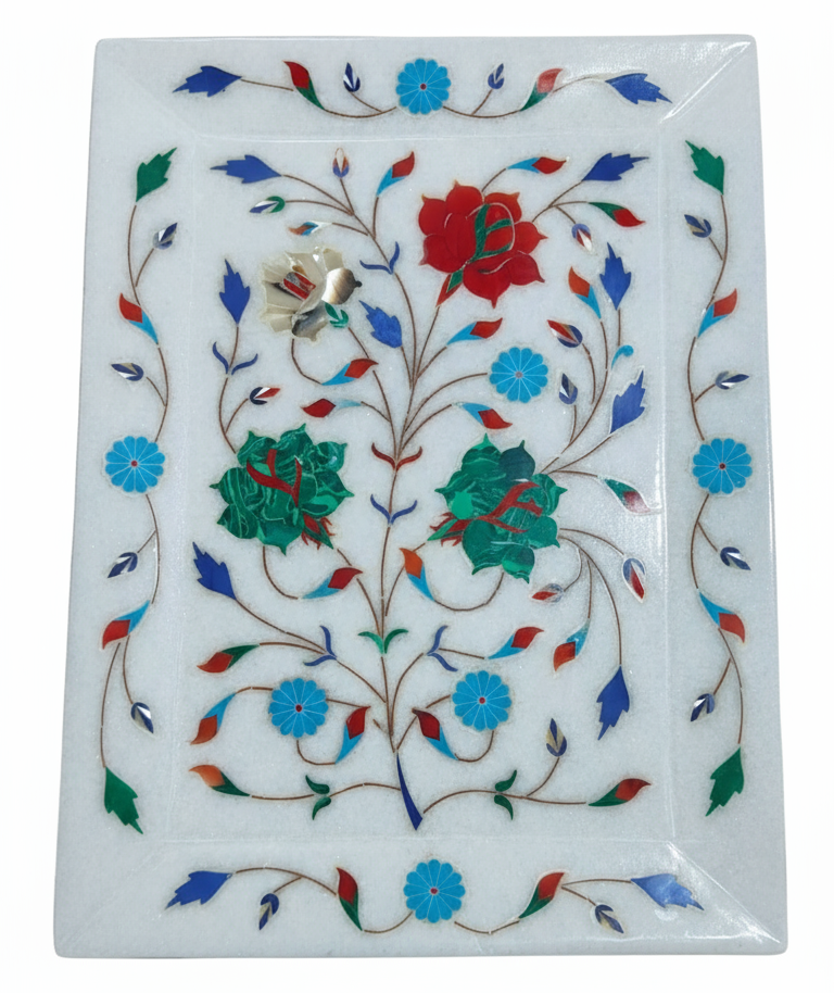 Handcrafted Floral Marble Inlay Tray Premium Semi Precious Stone Art Serving Decor