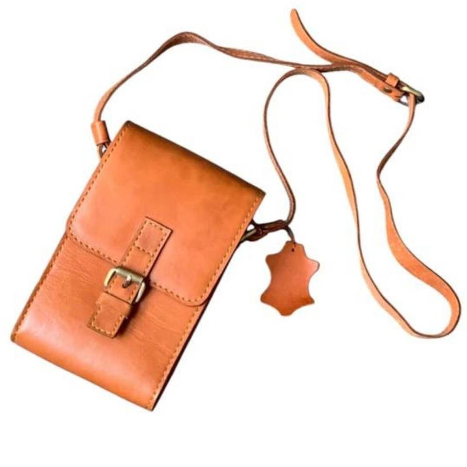 Handcrafted Genuine Leather Crossbody Phone Bag Classic Tan Brown with Adjustable Strap and Buckle Closure for Everyday Use