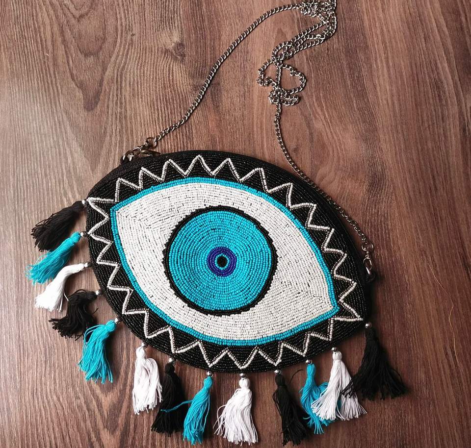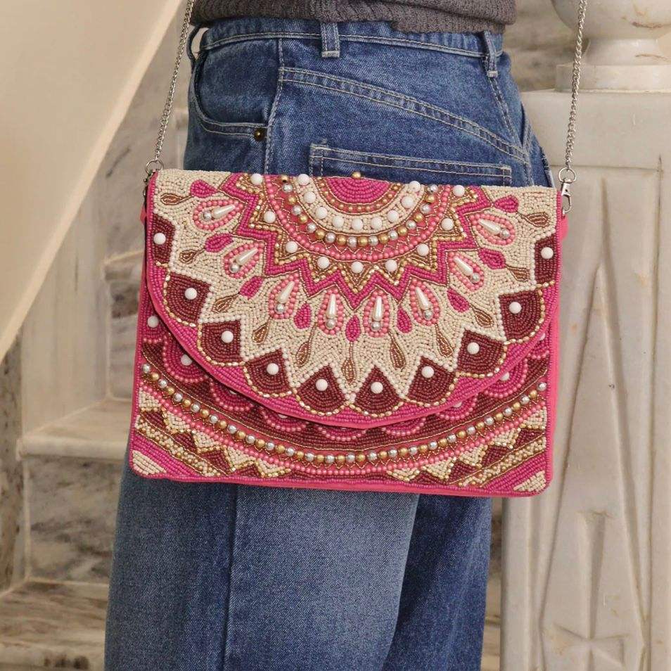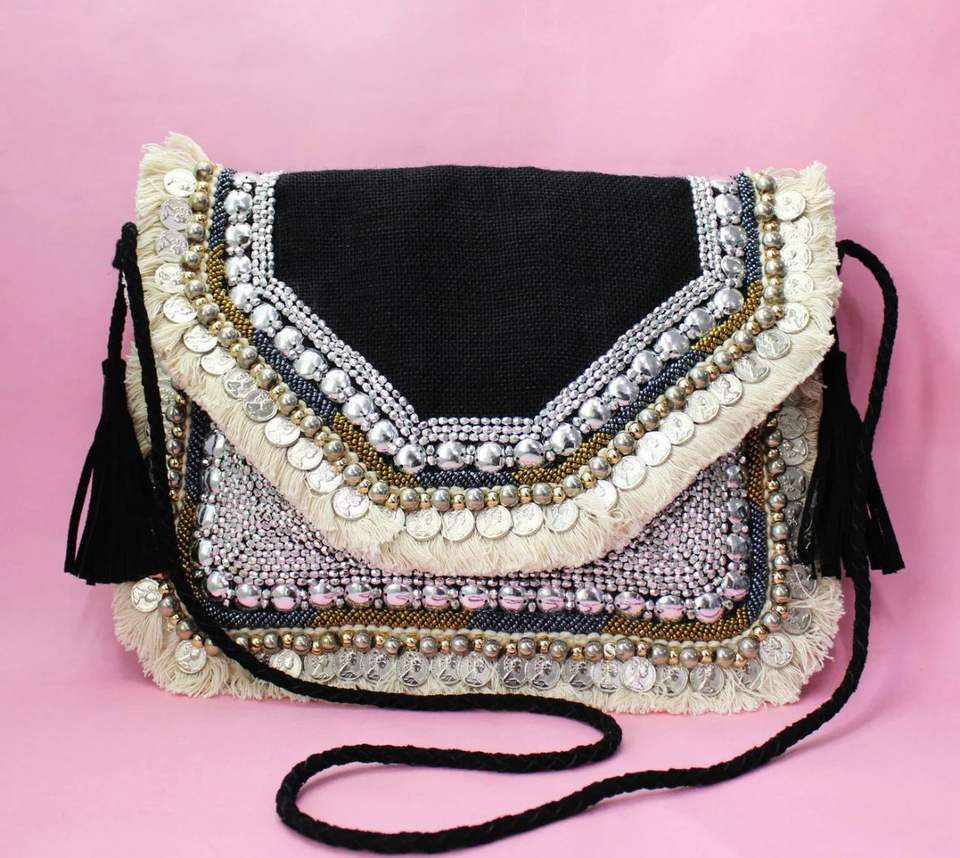 CRYSTAL CRAFT Handcrafted Girls/Women's Banjara Ethnic Canvas Clutch Sling Bag Traditional Embroidery Chain Bow Stone Shoulder
