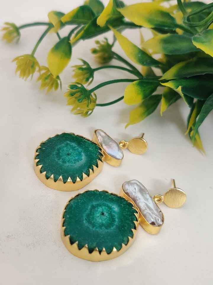Handcrafted Green Agate and Baroque Pearl Drop Earrings Gold Plated Statement Jewelry Luxury 18kGold Plated Dangle Earrings