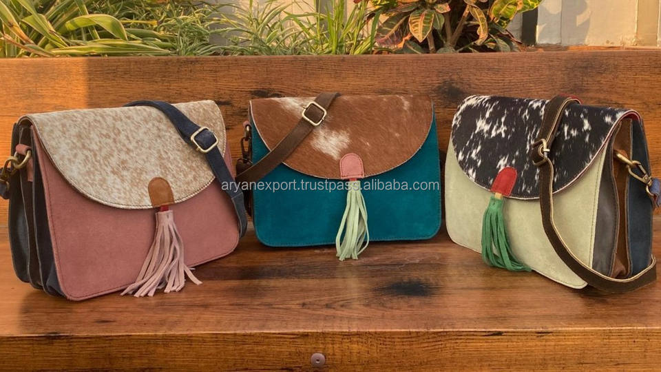 Handcrafted Hair on Cowhide Colorful Suede Leather Crossbody Shoulder Bags for Women Sustainable Recycled Leather Tassel Handbag
