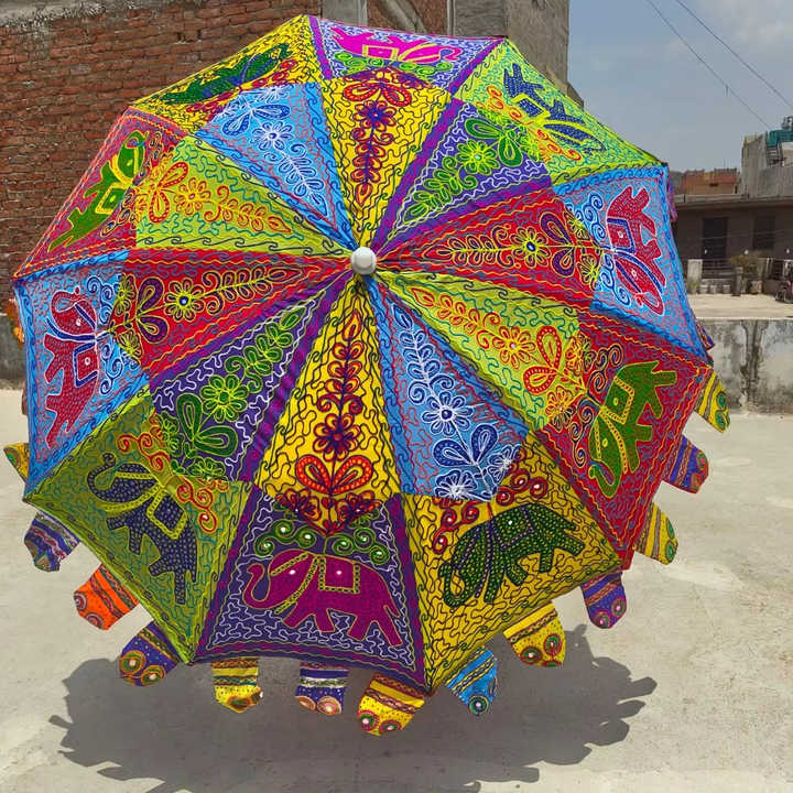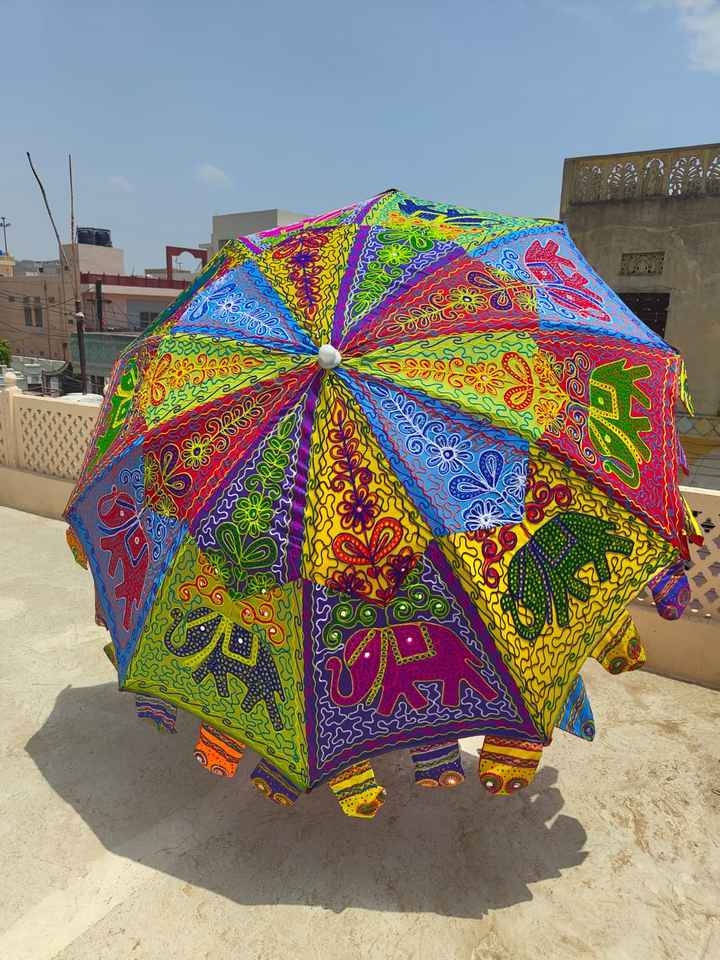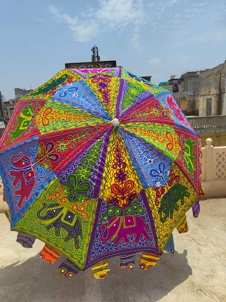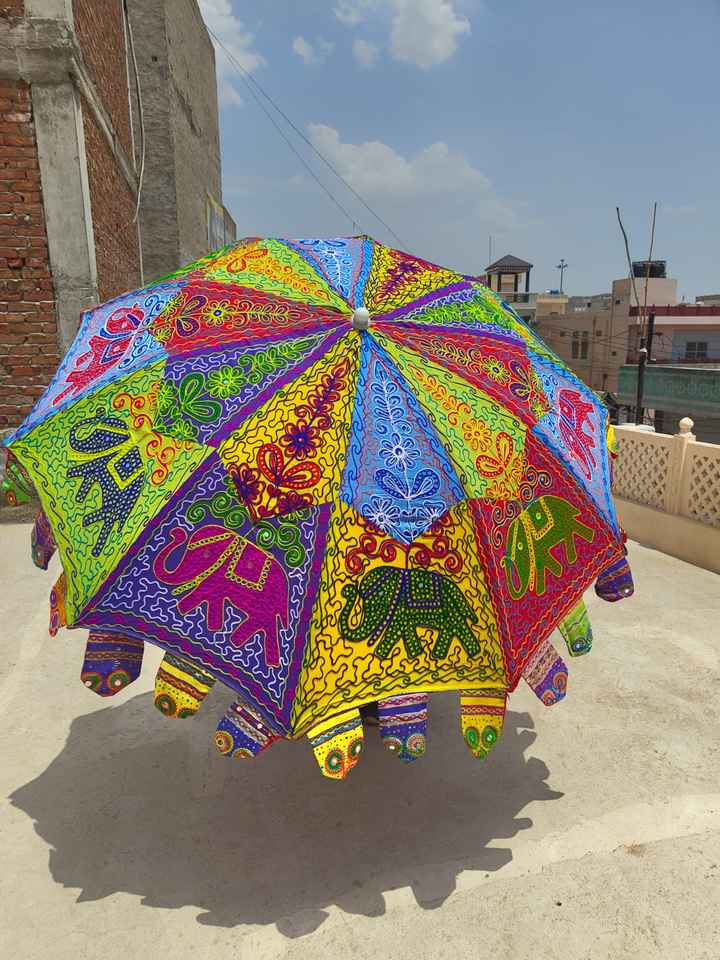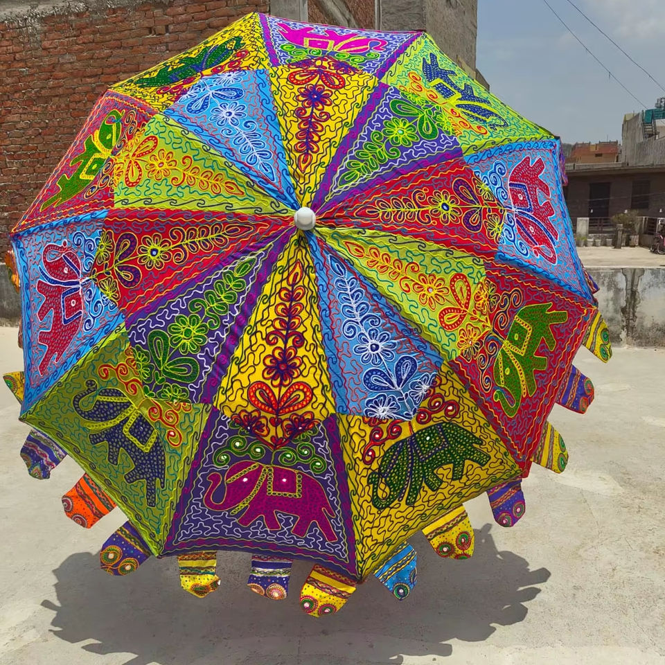 Handcrafted Indian Cotton Patio Umbrella Large Sun Garden Parasol Elephant Embroidery Decorative Beach Cafe Wedding Outdoor