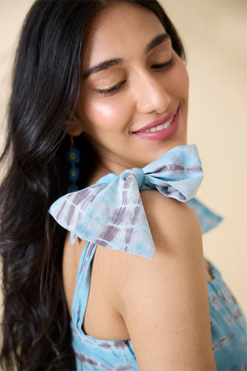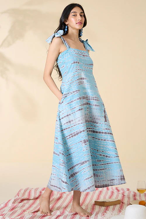 Handcrafted Indigo Tie-Dye Cotton Strap Dress With Pockets Side Zipper Loose Fit Women Summer Resort Dress