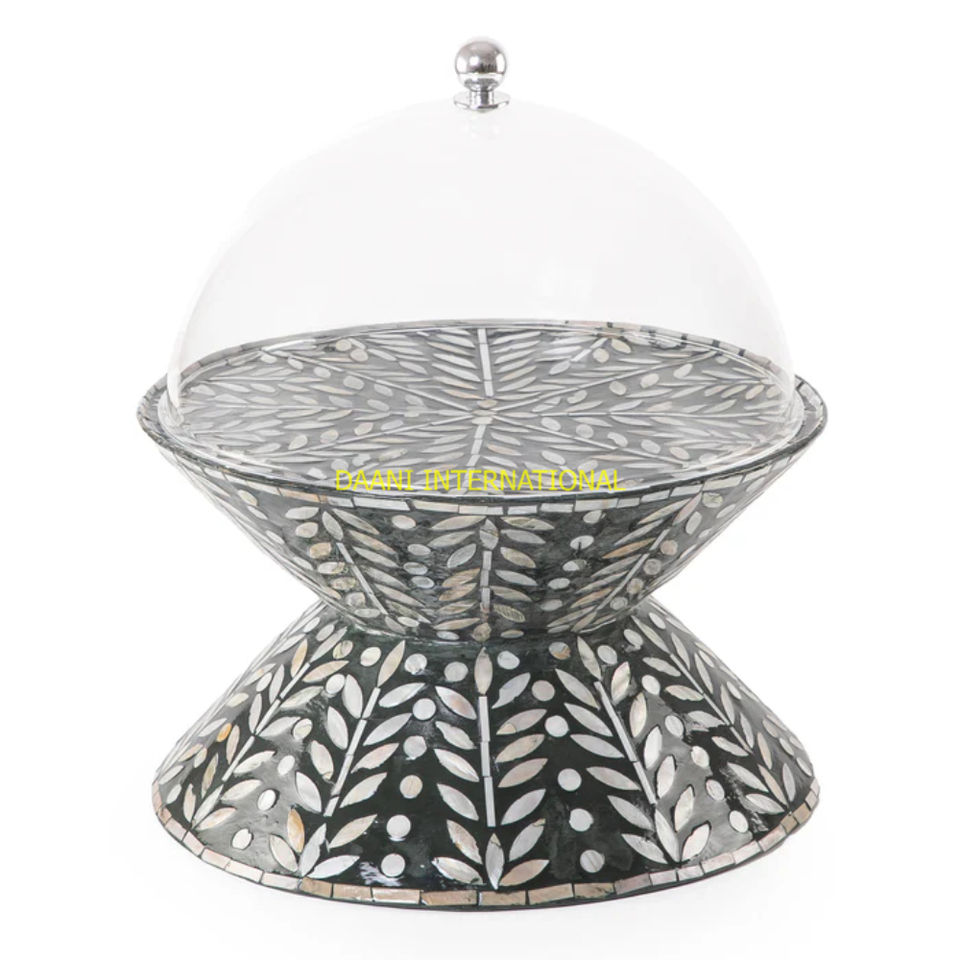Handcrafted Ivory Decorative Cake Stand with Floral Inlay and Glass Dome Cover for Serving Cakes Pastries Desserts and Party Use