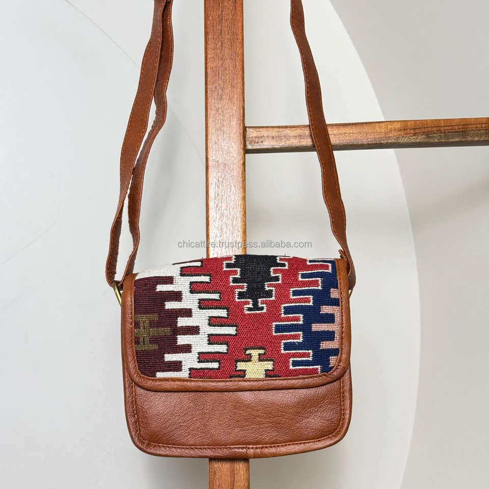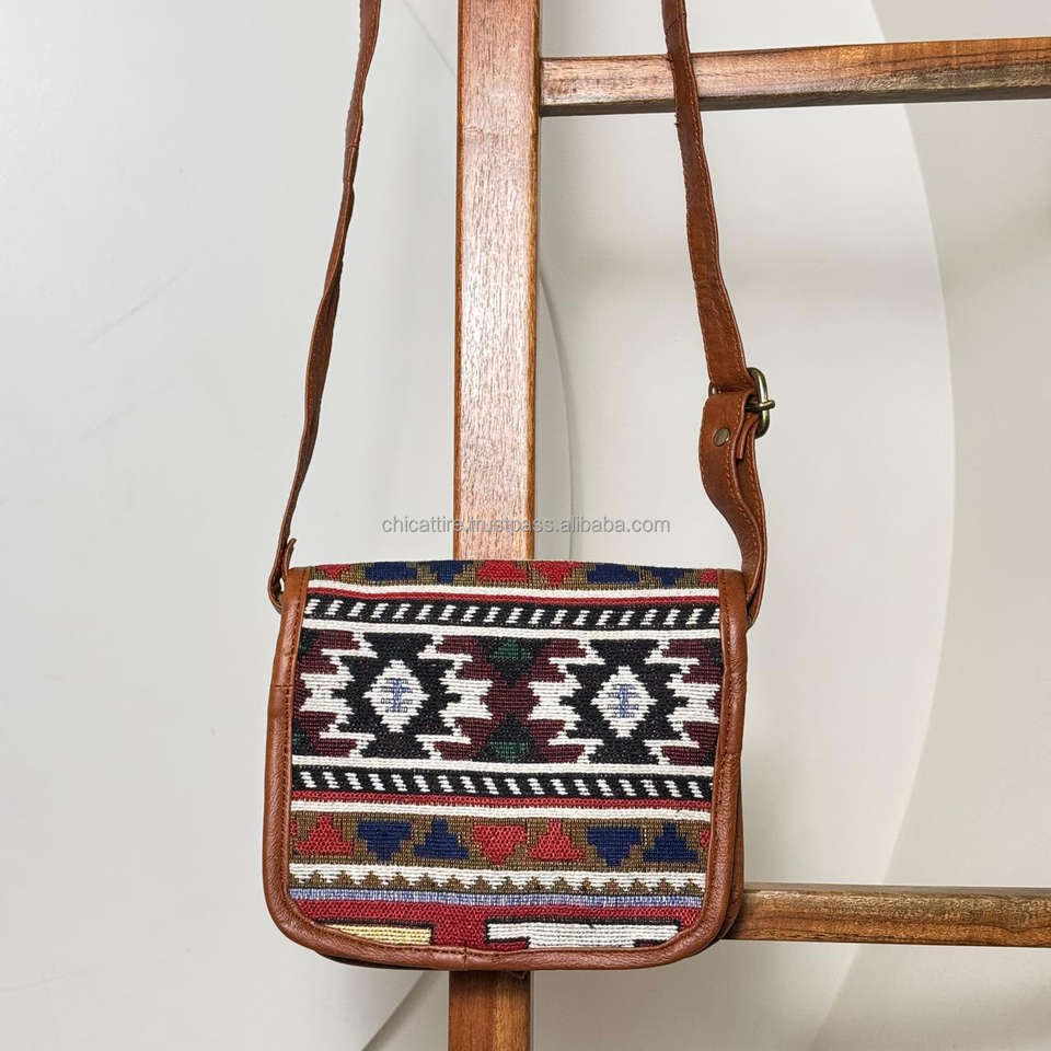 Handcrafted Leather Jacquard Kilim Crossbody Bag for Women with Adjustable Strap Tribal Pattern Sling Bag for Travel & Daily Use