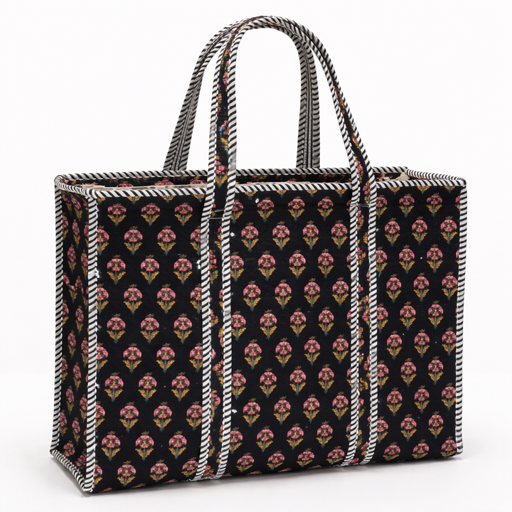 Handcrafted Lightweight Blue Carnation Print Quilted Cotton Tote Bag Zipper Ethnic Floral Motif Large Capacity Women Shoulder