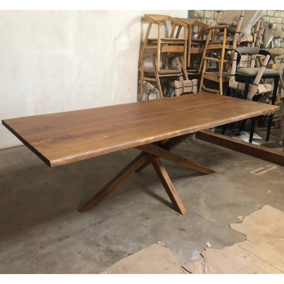 Handcrafted Live Edge Solid Teak Wood Rectangular Dining Table Modern Durable Stable Large Capacity X-Base Wooden Dinner Table