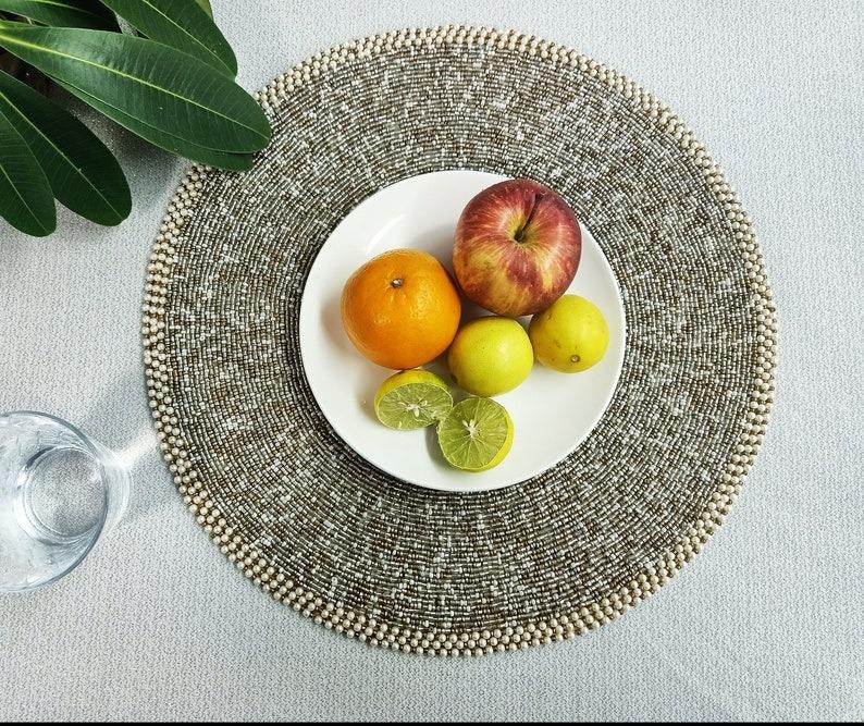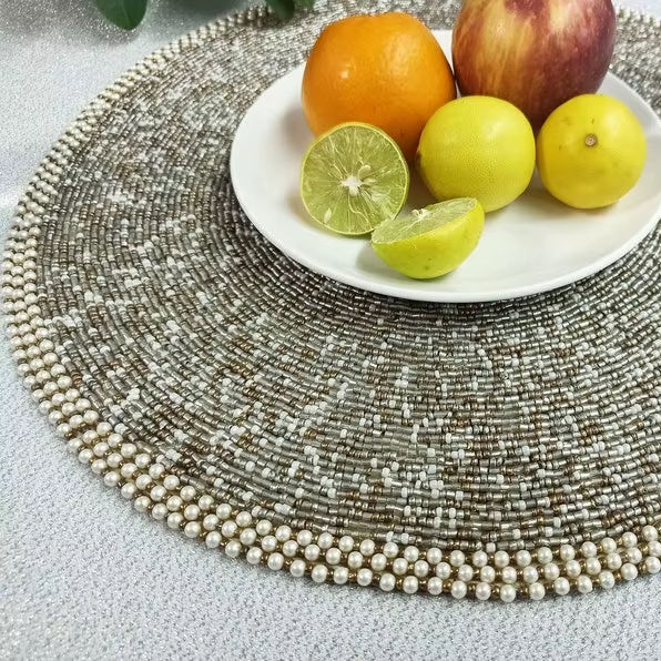 Handcrafted Luxury White Gold Beaded Linen Placemat Custom Embroidered Eco-Friendly Wedding Table Mat Charger Plate